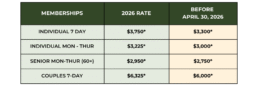 * Member discounts do not apply to already reduced items, packaged discounts or special promotions. Monday to Thursday Memberships do not include holidays. Members may book into any available tee time, tournaments or events may be scheduled through the season that may limit or prohibit play at some times.