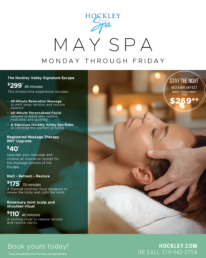BOOK NOW SPA MENUBOOK SPABook any spa treatment and enjoy full access to our resort amenities, including the indoor pool, dry sauna, and outdoor pool. Make the most of your spa day. SPA HOURS Monday – Thursday: 9:00am – 3:00pm Friday & Saturday: 9:00am – 5:00pm Sunday: 9:00am – 4:00pm SAY I DOGET STARTED FOR FOODIESGET STARTED GREAT GETAWAYSGET STARTED TIME OUTGET STARTED